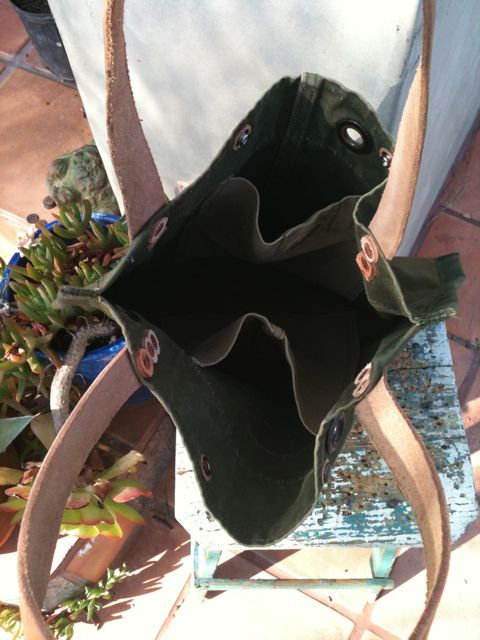 | interior has two pockets and large center area, two button snaps to close the bag |